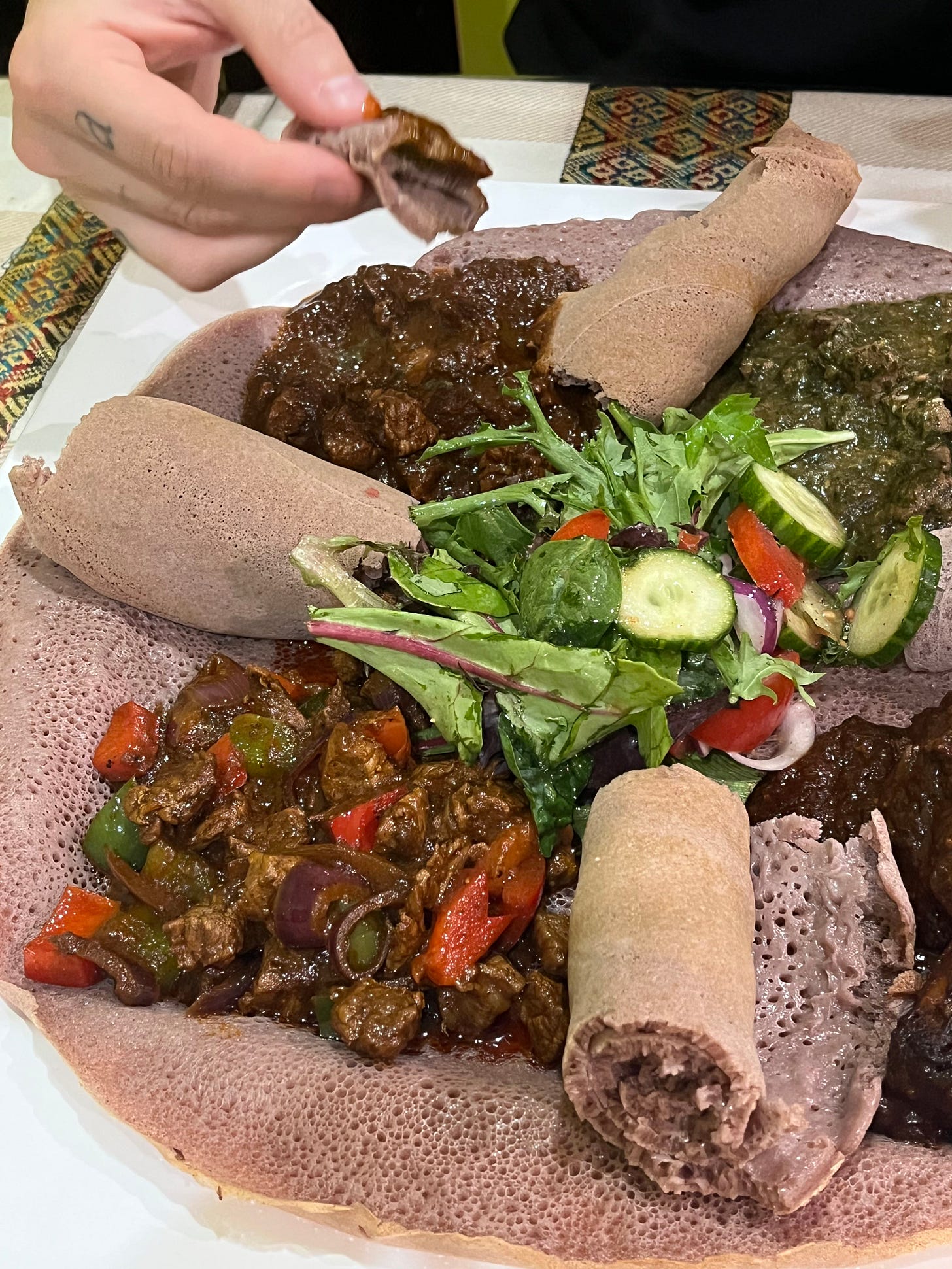 The menu covers a bit of everything: crispy filo parcels stuffed with spiced beef mince, lentil stews and choose-your-own meat and veg platters that come with ample injera (fermented flatbread) for dipping.