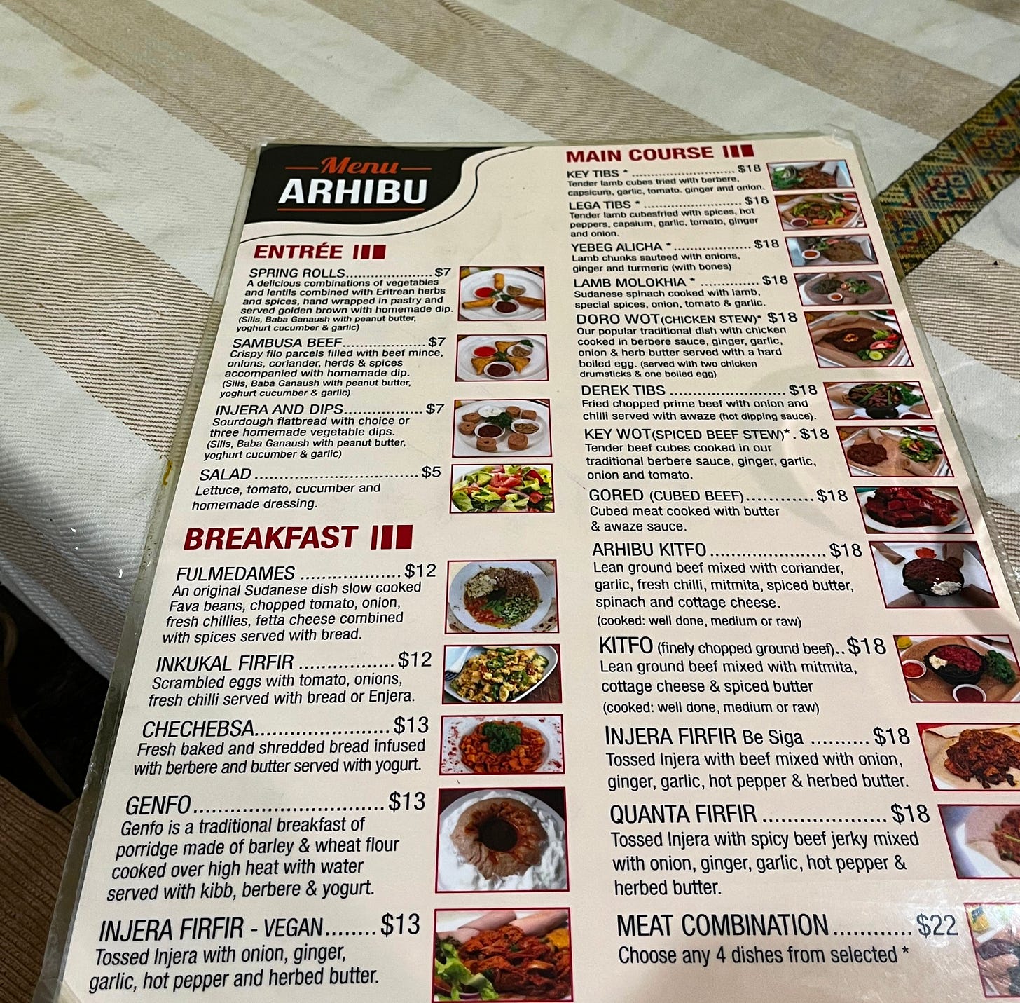 On the lower ground of the arcade is Arhibu Restaurant, a small Ethiopian and Eritrean restaurant. The space feels like a family home, lined with traditional Ethiopian art and artefacts. On a Friday night, the place is lively with groups of friends and families.