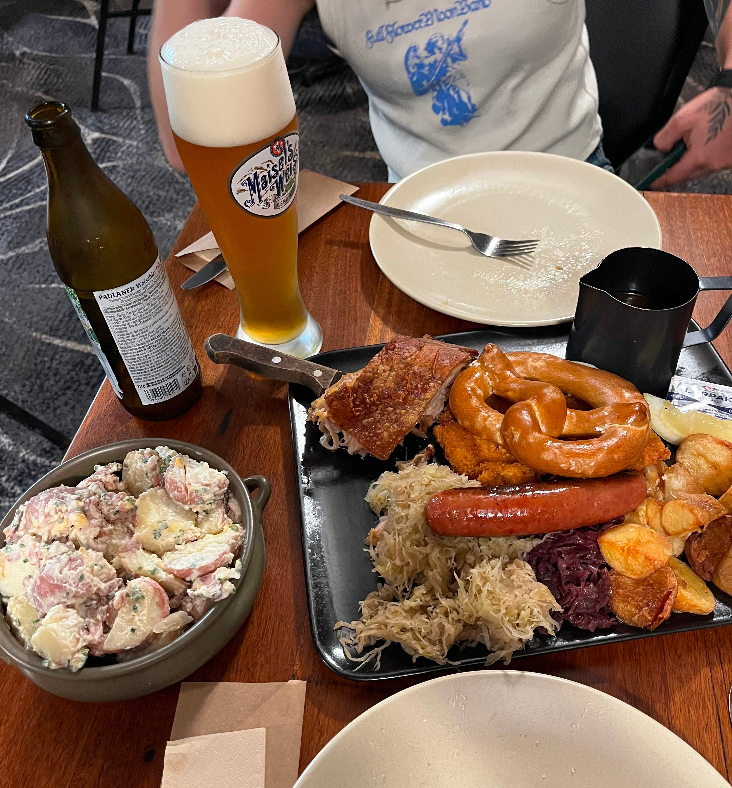 Then came the main act. This is where I felt a little bit geared up, oddly, like a competitive eater about to throw down. Perhaps it was because of the sheer amount of protein and carbs in front of us. The lowdown? Cheese kransky (excellent, 10/10), roast pork belly (typical, 7/10), roast potatoes (7/10, could’ve been crispier and better seasoned), chicken schnitzel (3/10 quite bland, dry meat), braised cabbage and sauerkraut (5/10 for gut health) and the gravy (6/10 not house made but very nostalgic). We also mistakenly ordered a classic potato salad — very unnecessary but a nice, light respite for the other rich food.