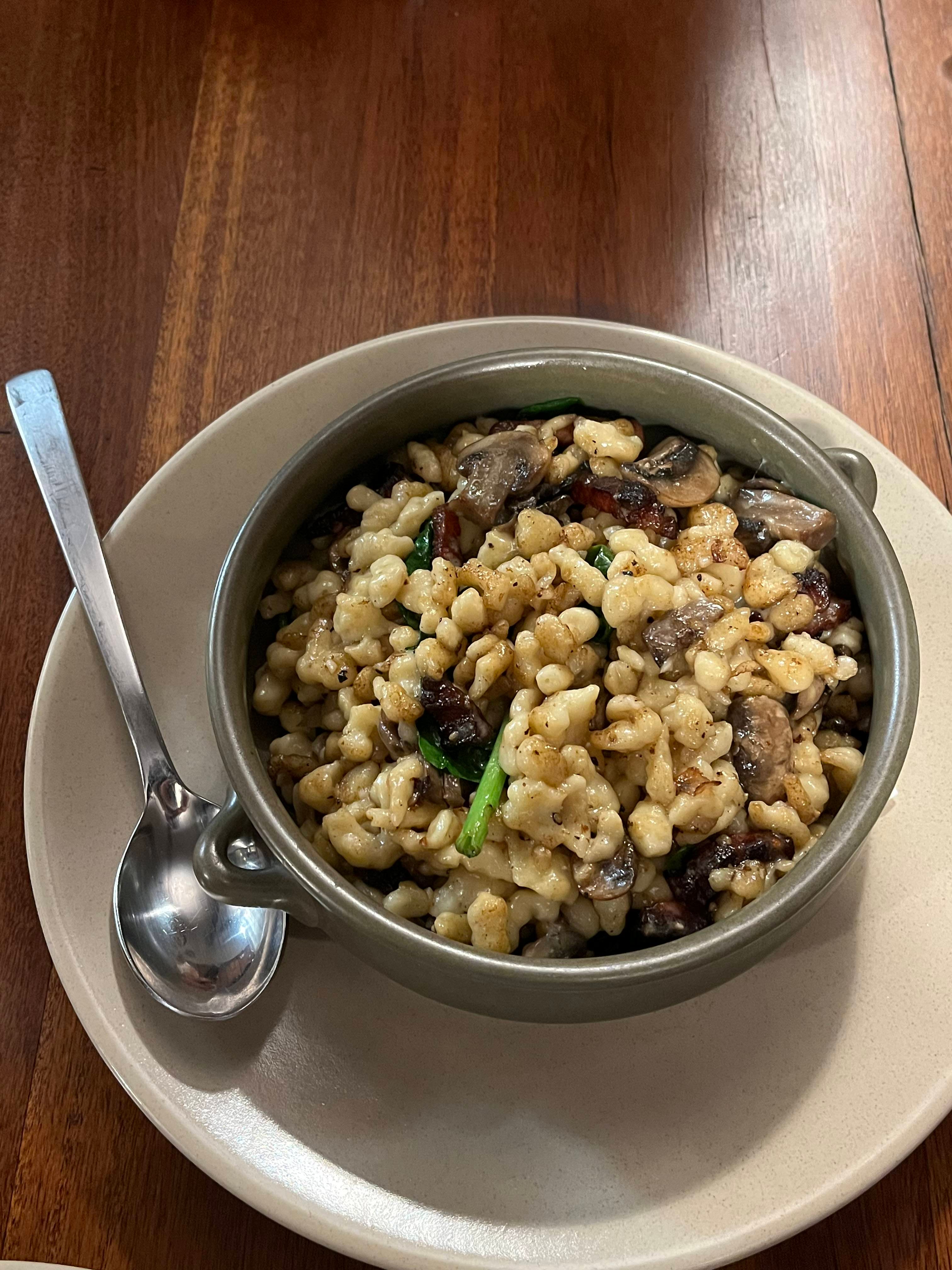 Behold: my first ever spätzle. (And definitely not my last.) This was a cross between a dry-ish carbonara and weeknight fridge cleanout (in a good way?). Crispy, salty bits of speck and mushrooms were littered throughout a well-buttered, irregularly-shaped egg pasta. It’s meant to be eaten as a side to saucy meat dishes, hence the relative plainness but I would absolutely eat this as a meal any day of the week.