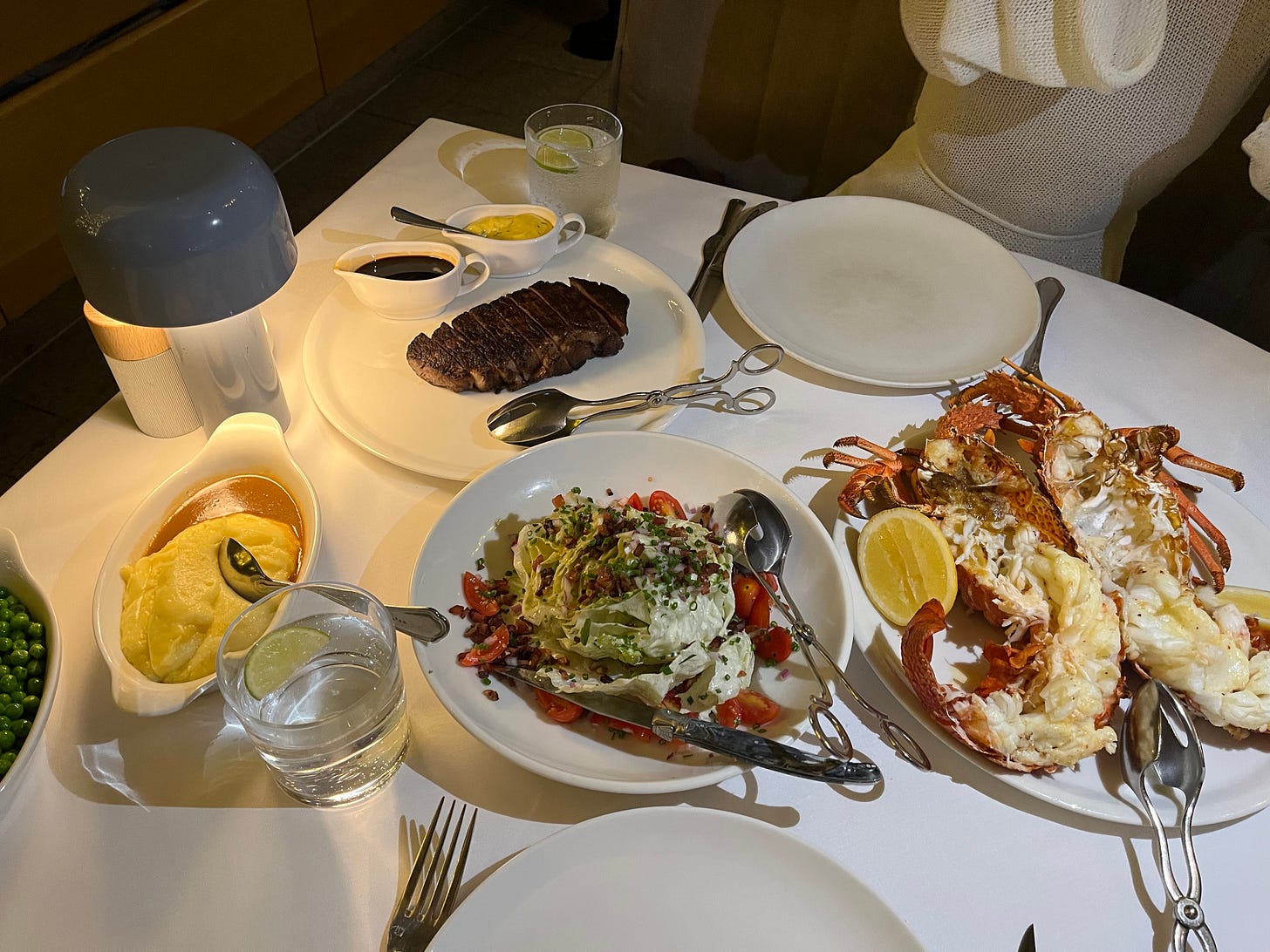 For mains, we ordered a kilo of Southern Rock lobster grilled with garlic butter and the Stockyard New York cut sirloin, medium rare of course, with bearnaise and red wine jus. Dare I say lobster might be the most overrated crustacean — Moreton bay bug or scampi are 1000% better (size matters rule applies, not in the way you think) — but the glamour and luxury of lobster is undeniable and sometimes essential. This particular one was cooked perfectly but the garlic butter was nary present. Girthy lobster meat (sorry) calls for seafood boil levels of butter.