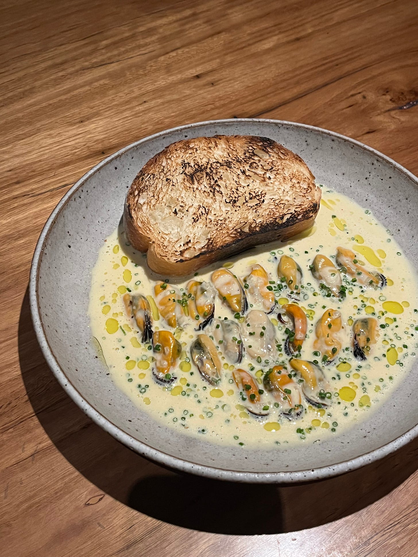 Before the mussels, I snacked on baccala mantecato, a Venetian appetiser of whipped salt cod on toast. This was texturally sound — the crumbly chickpea vessel (arguably too crumbly — needed better structural integrity) was a necessary contrast for the creamy fish spread. Nicely seasoned but needed a pop of acid.