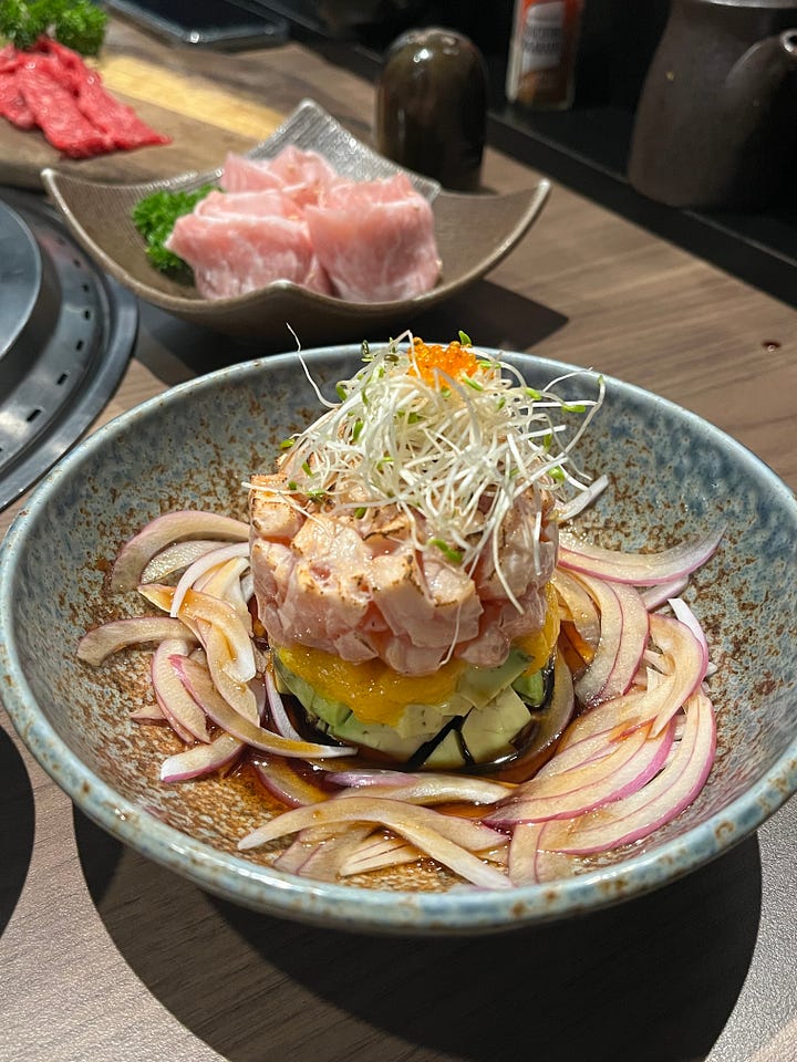 They also had a small raw selection of salmon sashimi and beef and salmon tartare. The salmon tartare was Hawaiian-style with diced avocado and mango, red onion and aburi salmon. I’d recommend eating it over some rice with extra soy — a nice poke break from the rich meat.
