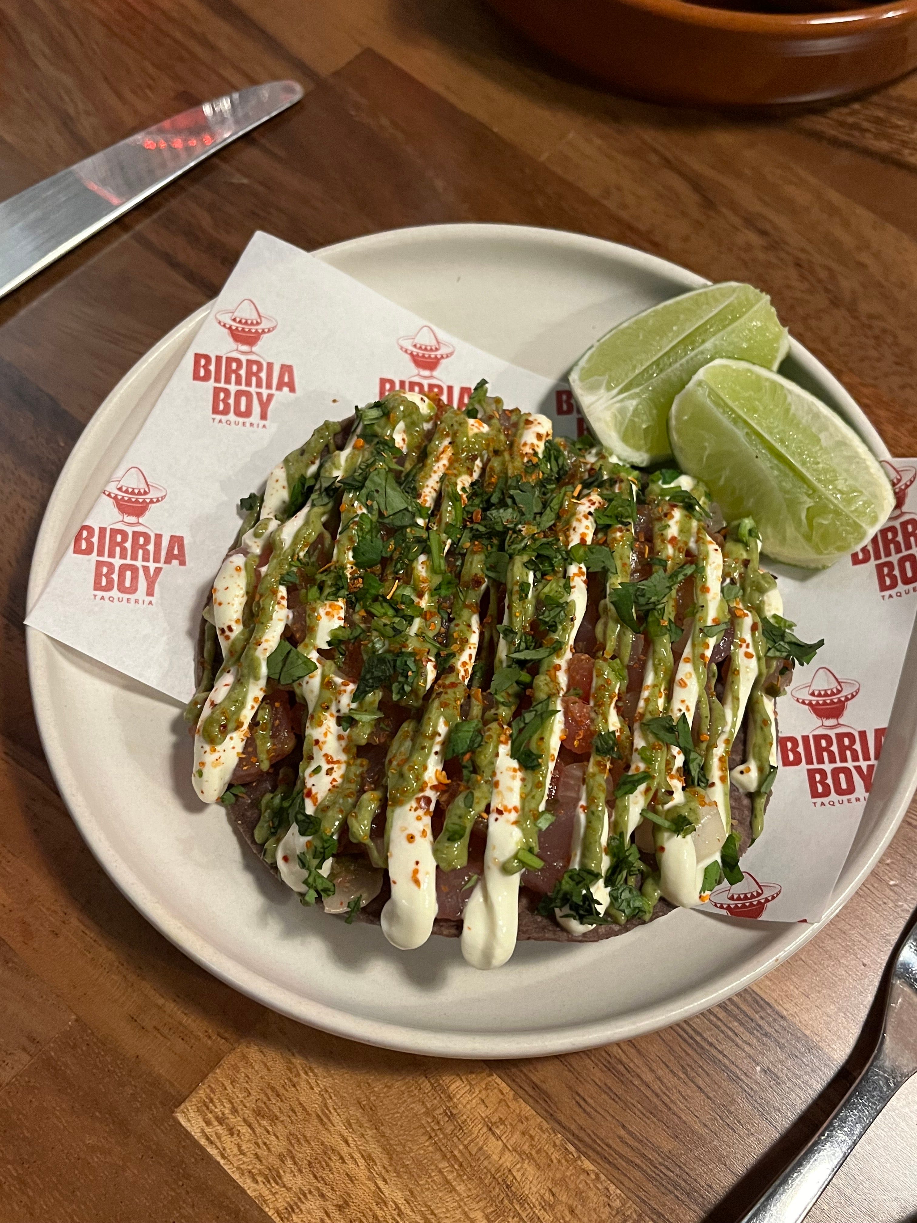 Raw fish + creamy sauce + acid + crunchy vessel = I’ll have 14. Tuna belly is also hugely underrated — it’s tender and fattier than regular tuna. And they’ve nailed the tostada. Start with this and then have a duck carnita and a goat birria taco. Thank me next year.