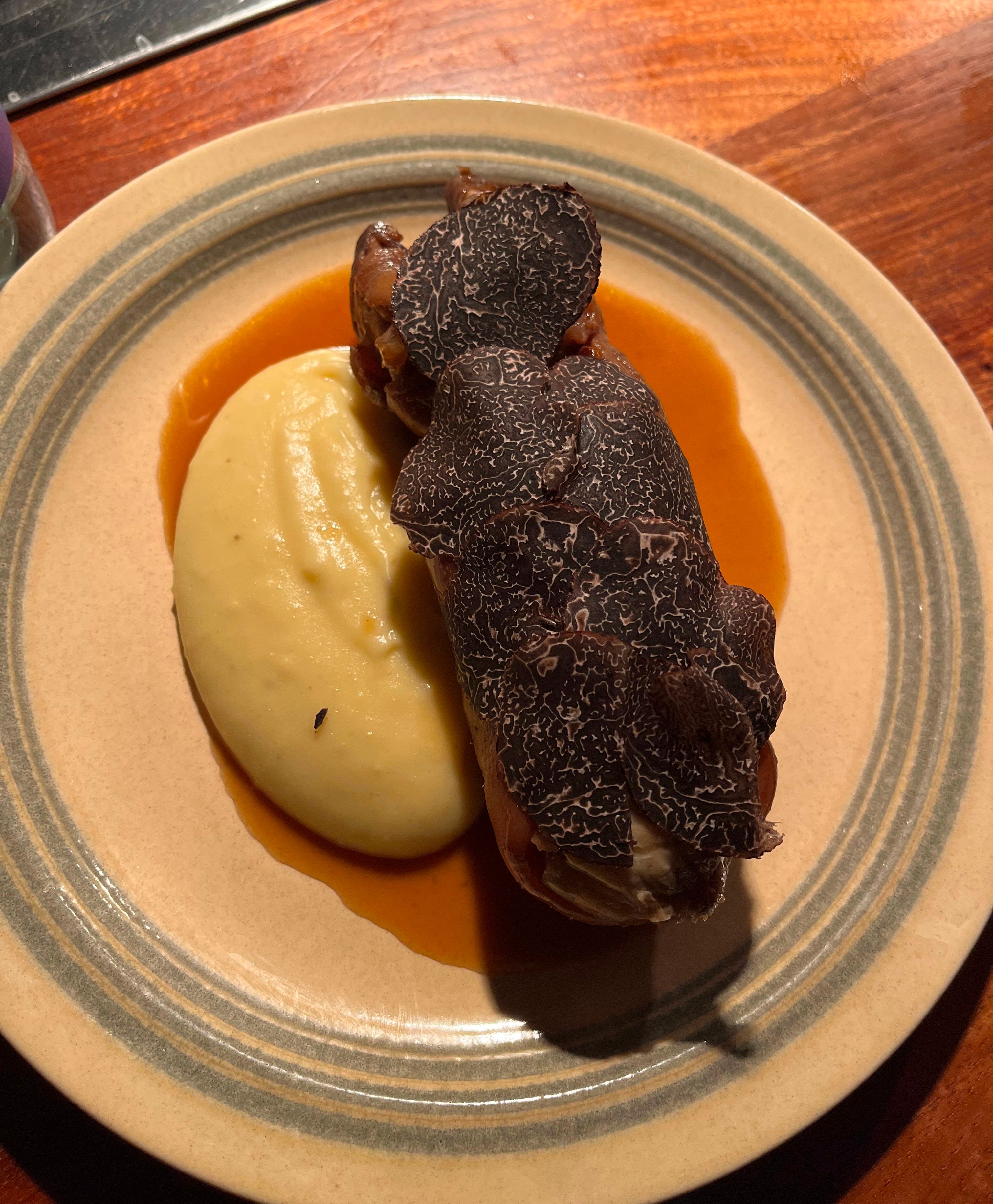 This dish is a true classic. Trotter a la Koffmann (invented by Pierre Koffmann) involves deboning a pig’s trotter, butterflying it and stuffing it with chicken mousse and mushrooms. The stuffed trotter is then rolled, wrapped in foil, chilled to set then warmed for serving. Buttery potato purée and a jus are traditional accompaniments. This was my first Koffmann trotter (and hopefully not my last — it’s hard to come by these days). It was a perfect fate that I got to eat this during winter because I couldn’t imagine a better time to experience a dish. And with a layer of freshly shaved truffles during peak truffle season? Stop that, I’m blushing.