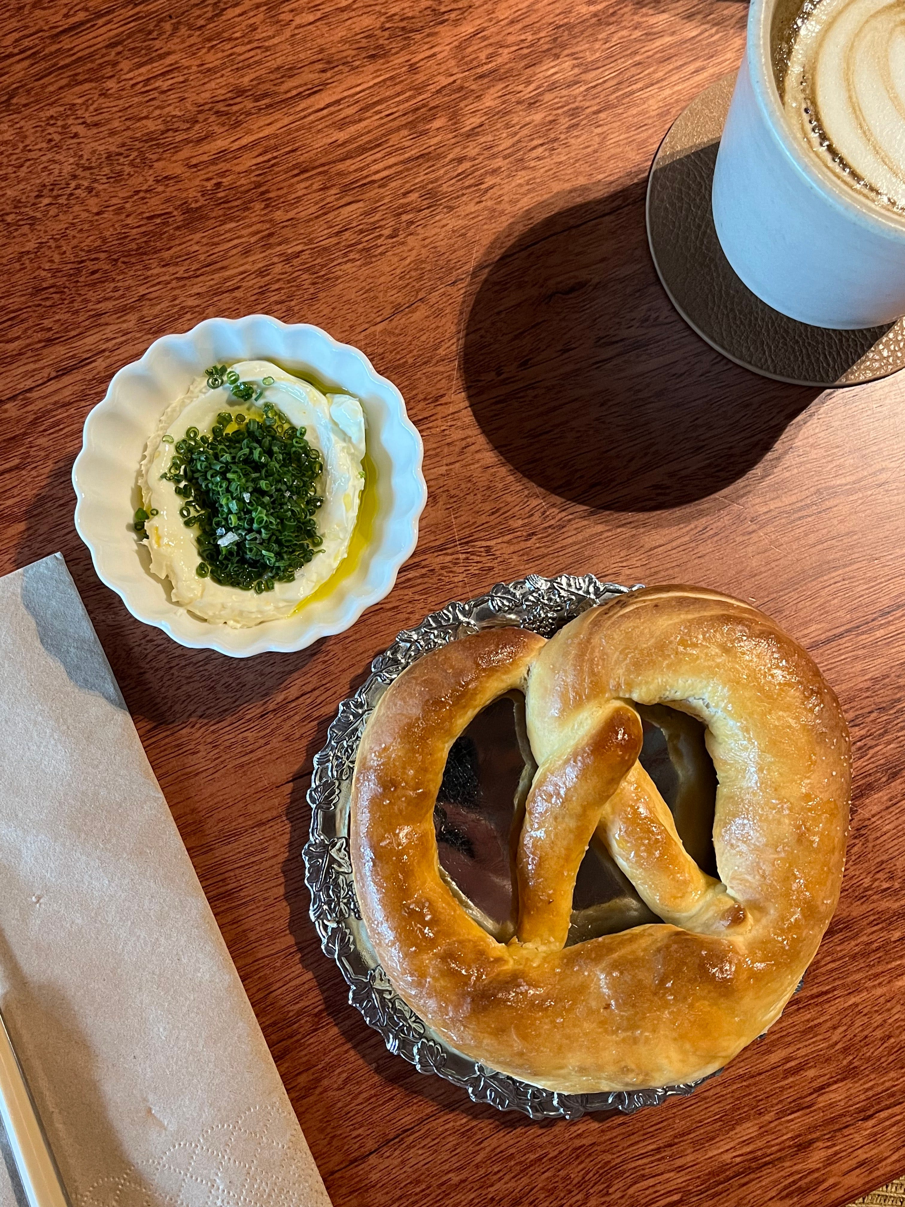 Every time I visit Snug I have to get this pretzel. It’s fresh, it’s hot and it’s gorgeous lathered in cream cheese, flaky salt and chives. I am obsessed with how different (in a good way) the pretzel tastes as you eat — my favourite part is the knot bit at the middle, so crunchy.